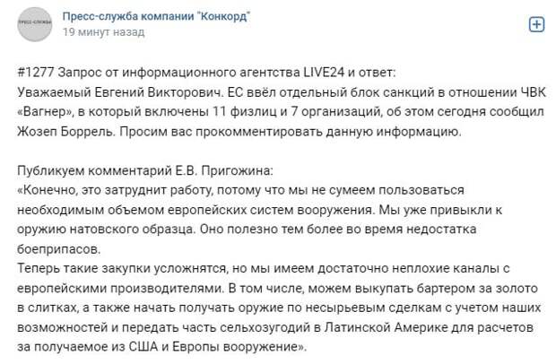 По словам предпринимателя, сложившаяся ситуация создаст определенные проблемы для «вагнеровцев».«Конечно, это затруднит работу, потому что мы не сумеем пользоваться необходимым объемом европейских систем вооружения. Мы уже привыкли к оружию натовского образца. Оно полезно тем более во время недостатка боеприпасов», – сказал он.