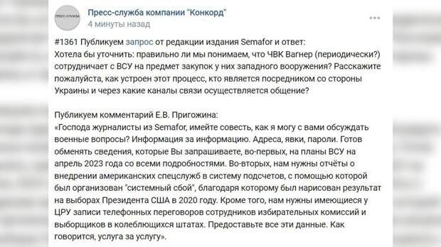 информацию, то Пригожин расскажет то, о чем они просят, в рамках формата «услуга за услугу».