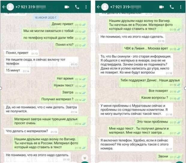 "Материал завтра наши турецкие друзья просят очень. Нашим друзьям надо волну по "Вагнер". Ты начнешь ее в России. Материал — фото, которые надо вставить в текст. ЧВК в Ливии, Москва врет", — написал куратор Денису Короткову, после чего тот попытался отказаться выполнять такой заказ.